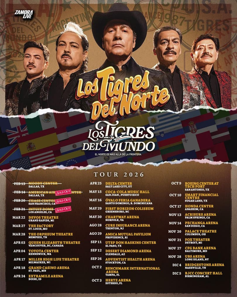La agrupación llevará su espectáculo a Estados Unidos, el Caribe y República Dominicana, en una ruta que combina arenas históricas, teatros emblemáticos y recintos de gran capacidad. Cada fecha forma parte de “Los Tigres del Mundo: El Norte Más Allá de la Frontera”, una producción de Zamora Live que busca ofrecer una experiencia de alto nivel y reafirmar el estatus del grupo como “Los Ídolos del Pueblo”.